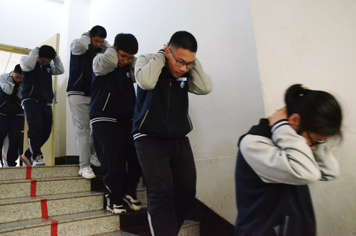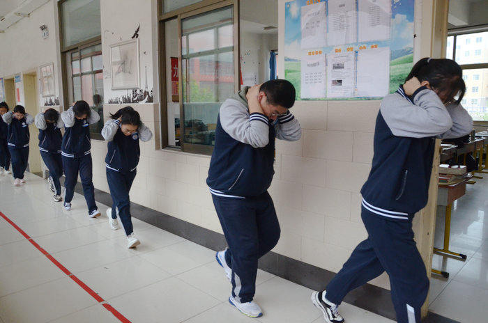增强自救技能,做好疏散演练。做好教育活动的同时,结合我校实际,开展防震疏散演练。本次演练活动分“室内紧急避震”和“室外疏散”两部分。“室内紧急避震”演练主要围绕“地震逃生的黄金12秒,进行就地紧急避震”,学生躲在课桌下、课桌边、三角形空间、墙根、墙角的地方双手护住头部和颈部避震,千万注意要远离外墙、阳台、门窗等危险的地方。“室外疏散”演练要求师生积极配合做到安全、有序、快速的按照预定疏散路线撤离到安全地带。整个演练过程既紧张又有条不紊,没有发生任何碰撞事故,真正掌握在地震中逃生、自救自护的基本方法,提高我校对抵御和应对紧急突发事件的能力。