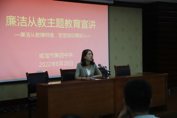 王玉洁校长进行“廉洁从教铸师魂,坚定信仰育新人”主题教育宣讲,号召全体教职工扛好廉洁这面旌旗,守好廉洁这座灯塔,本着“淡泊人生蓄以明志,廉洁做事方能致远”的理念,严以修身、严以治校、严以治学。王校长围绕学校课程体系完善、管理体系变化、评价体系构建,对学校在多元课程、学生管理、教师培养等方面的重点工作目标进行解读,强调全体教师要牢固树立“全面发展,多元育人”的理念,寻找适合每个学生的成长道路。