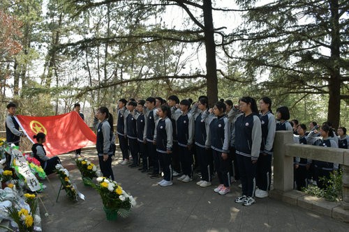 参观完纪念馆,学生会主席于魏欣带领同学们肃穆有序地进入天福山烈士陵园。学生代表托起花篮,缓缓走向纪念碑,向烈士们敬献鲜花。鲜花尽情绽放,寄托着大家对革命烈士的深切缅怀和崇高敬意。伴随着追思感怀的哀乐声,全场肃立,向为争取民族独立和人民解放、为实现国家富强和人民幸福矢志奋斗的烈士们鞠躬默哀。革命烈士纪念碑前,高一学生代表丁芊彤和高二学生代表谷伟霖分别献词,方希月同学带领全体学生宣誓。铮铮誓言回荡在纪念碑下,大家必将牢记这庄严的时刻,传承红色基因,赓续红色血脉。