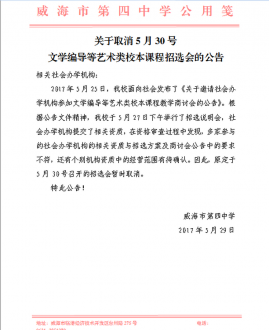 关于取消5月30日文学编导等艺术类校本课程招选会的公告 2017-05-29 -